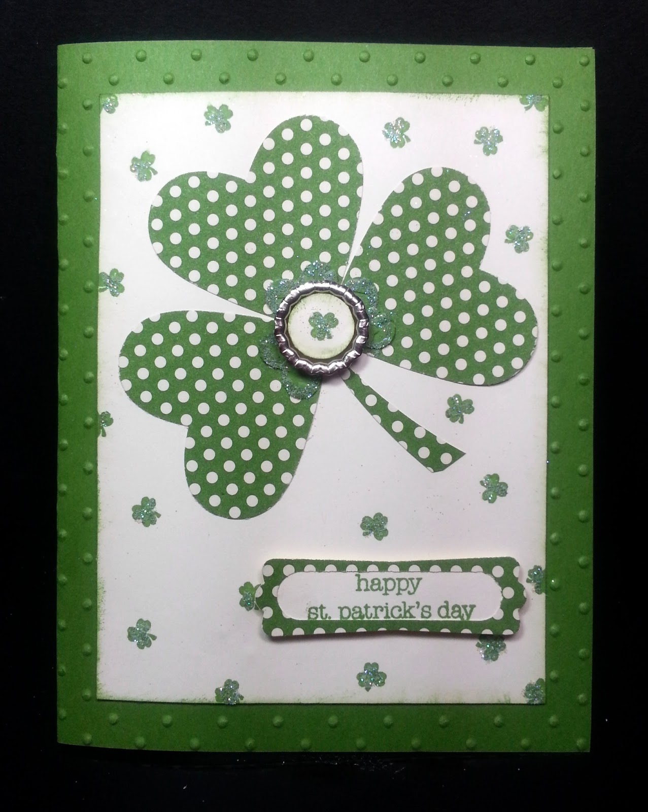 I also really like the Soda Pop Tops but I never know how to use them – flattened as above and not flattened looking like a pop top – both are fabulous. The cutest stamp set is the Itty Bitties from the Spring Catalogue and how great that they fit into the small pop tops. The Shamrock is made with the heart punch and the…Be Of Good Cheer DSP – Gumball Green polka dots from the Christmas Paper! Teeny Tiny Wishes for the sentiment, Modern Label, Word Window punches! I used glitter because after all it is St. Patty’s Day!