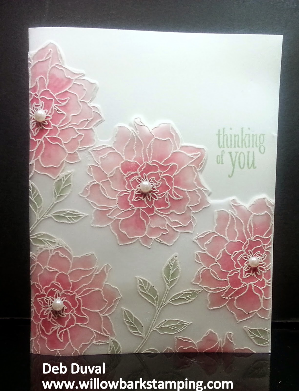 At Club I gave everyone a choice of the base cardstock colour. Which one would you prefer the Whisper White or Pink Pirouette? This card is so soft with either colour and I just love the technique of Stained Glass with White Embossing Powder.